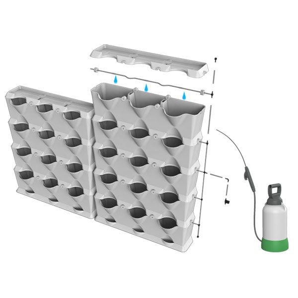 Vertikálne moduly Minigarden je možné stohovať, umiestniť vedľa seba alebo chrbtom k sebe. Môžu byť tiež použité v spojení s Minigarden Corner v rohoch alebo na vytvorenie uhlov 90 stupňov. V prípade, že plánuje postaviť väčšiu živú stenu, môžete si ju zložiť z tzv.vertikálnych modulov a podložiek. Ide o rovnaké komponenty, z ktorých sa skladá vertikálny set. Výhodou je, že pri výstavbe väčších živých stien si kúpite presne toľko modulov a podložiek, koľko potrebujete.